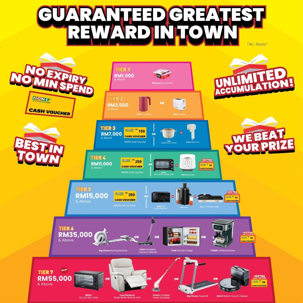 Many exhibitors offer better rewards when you spend more across different categories. For example, buying kitchen appliances together with furniture or bedding can move you into a higher reward tier. Higher tiers often include cash vouchers, free gifts, or bonus items based on total spending.