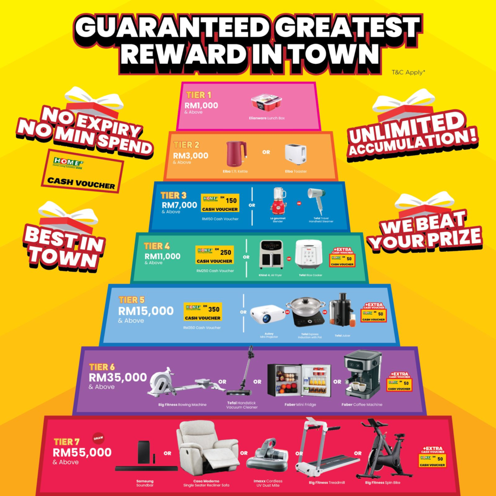 - Tier 4 (RM11,000 & above): RM250 HOME Cash Voucher or Khind 4L Air Fryer or Tefal Rice Cooker, plus an extra RM50 Cash Voucher